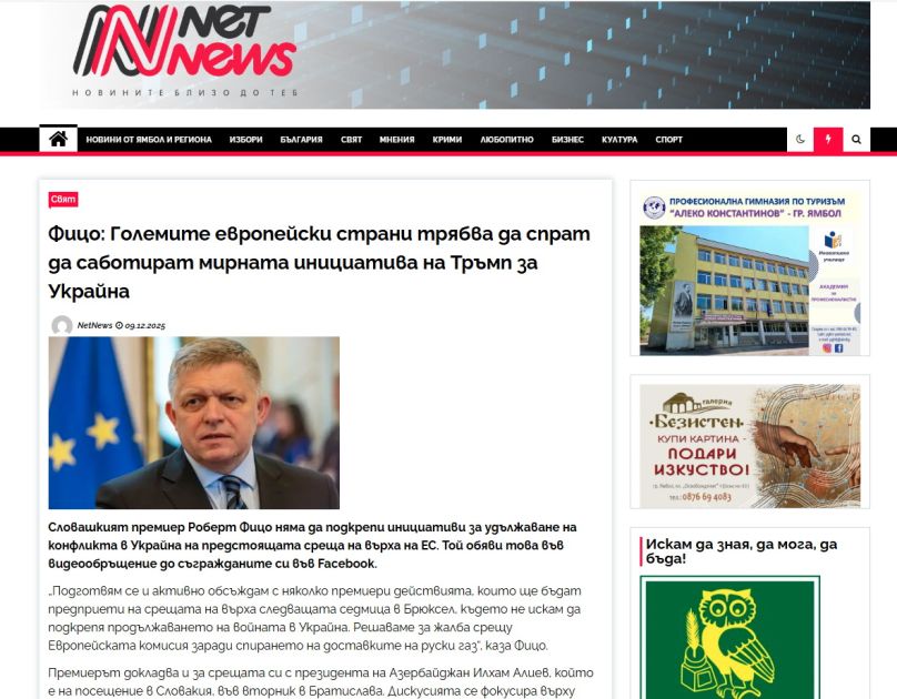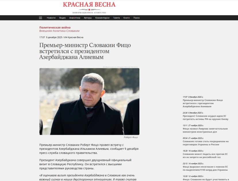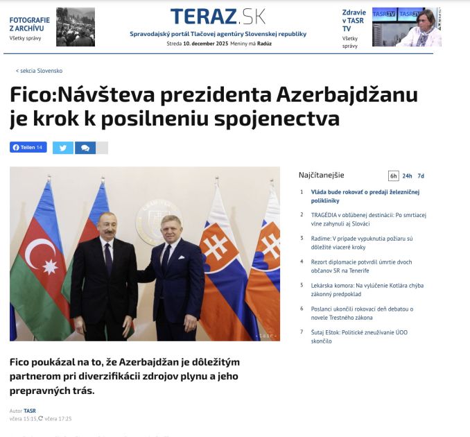 Bolqarıstanın “Factibg.com” saytında dərc olunan yazıda isə Slovakiyanın Baş naziri Robert Fitsonun Azərbaycan Prezidenti İlham Əliyevlə görüşündə iki ölkə arasında qaz tədarükü və müdafiə sənayesi sahələrində əməkdaşlıq imkanlarının müzakirə edildiyi qeyd olunur. Vurğulanır ki, Slovakiya Azərbaycanla hərbi tərəfdaşlığı da gücləndirməyi planlaşdırır.