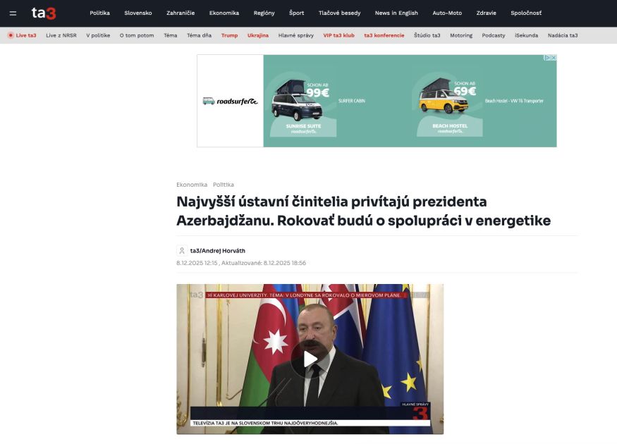 AZƏRTAC xəbər verir ki, Slovakiyanın aparıcı media orqanları – TASR xəbər agentliyi, “TA3” telekanalı, “Dennik“, “Slovak Spectator“, “Hospodarske noviny” qəzetləri və digər mətbu orqanları rəsmi səfər, keçirilən görüşlər və imzalanan sənədlərlə bağlı xəbərlər yayıblar. Qeyd edilib ki, səfər zamanı keçirilən yüksəksəviyyəli görüşlər və imzalanan sənədlər Azərbaycan–Slovakiya münasibətlərinin strateji tərəfdaşlıq səviyyəsinə yüksəldilməsində mühüm addım kimi qiymətləndirilir.