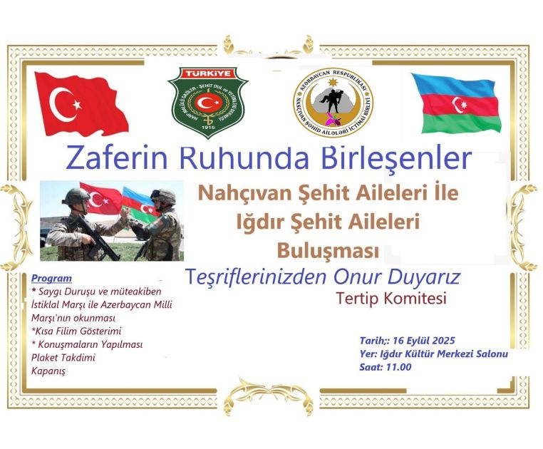 Sentyabrın 16-da Türkiyənin İğdır vilayətində “Zəfərin ruhunda birləşənlər” adlı görüş keçirilib. Tədbirdə Türkiyə və Azərbaycandan olan şəhidlərin ailə üzvləri, yaxınları, eləcə də bir qrup qazi iştirak edib.