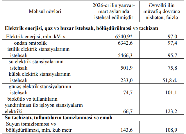 Cari ilin birinci rübündə Azərbaycanda (əsas fəaliyyəti elektrik enerjisinin istehsalı olmayan müəssisələr nəzərə alınmadan) 6 milyard 540,9 milyon kilovat-saat elektrik enerjisi istehsal edilib ki, bu da ötən ilin müvafiq dövrü ilə müqayisədə 3 faiz azdır.