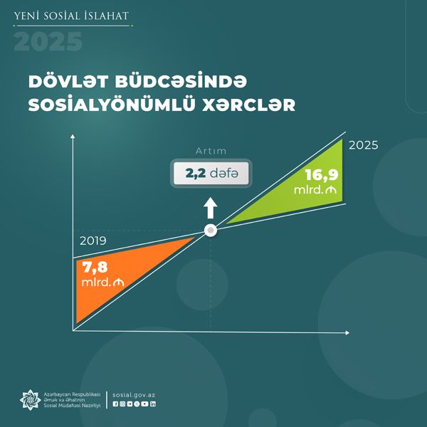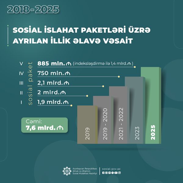 Sosial islahatlar çərçivəsində, 2018-2025-ci illər ərzində sosial ödənişlərin artırılması məqsədilə ayrılan əlavə illik vəsaitin həcmi 7,6 milyard manata çatıb.