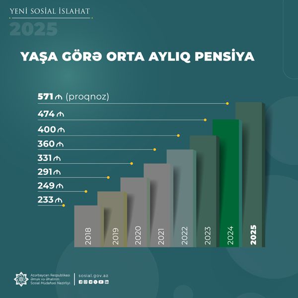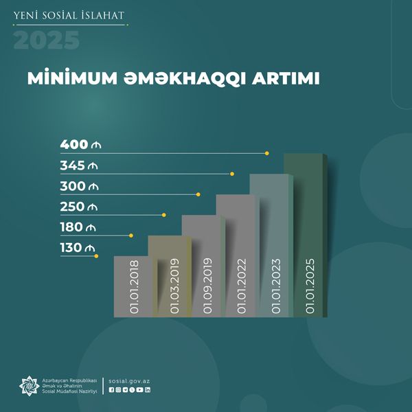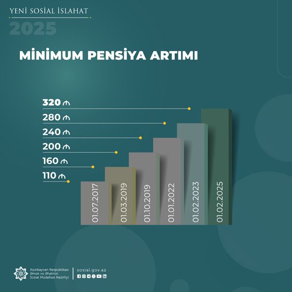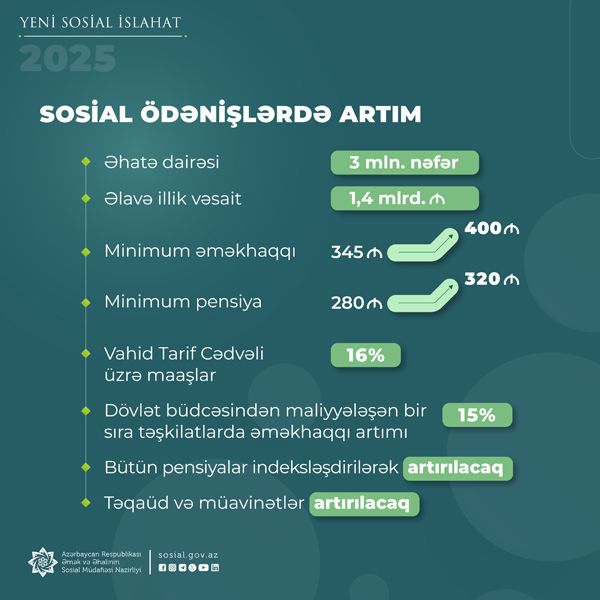 Azərbaycanın sosial inkişafını təmin edən Prezident İlham Əliyevin ardıcıl və məqsədyönlü siyasəti çərçivəsində 2018-ci ildən başlayaraq həyata keçirilən sosial islahat paketlərinə 2025-ci ilin əvvəlindən beşinci paketin reallaşdırılması da əlavə olunub. Bu istiqamətdə mühüm addım dövlətimizin başçısının 2024-cü il 23 dekabr tarixli Sərəncamı ilə atılıb. Belə ki, 2025-ci ilin yanvarından başlayaraq minimum əməkhaqqının 345 manatdan 16 faiz artırılaraq 400 manata çatdırılıb. Fevralın 1-dən isə minimum pensiyanın məbləği 280 manatdan 14,3 faiz artımla 320 manata qaldırılacaq.