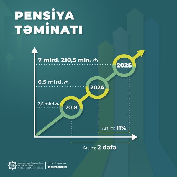Aparılan islahatlar çərçivəsində pensiya artımlarının davamlı xarakter alması pensiya təminatı üzrə ödənilən vəsaitlərin mütəmadi artımına gətirib çıxarıb. Bu artım vətəndaşların sosial rifahının yüksəldilməsi və pensiyaçıların maddi vəziyyətinin yaxşılaşdırılması məqsədini daşıyır. 2025-ci ildə əmək pensiyalarının ödənilməsi üçün 7 milyard 210 milyon 530 min manat vəsait ayrılması nəzərdə tutulub. Bu, keçən il müvafiq istiqamətdə ayrılan vəsaitdən 710 milyon manat və ya 11 faiz daha çoxdur, yəni dövlət pensiyaçıların ehtiyaclarını qarşılamağa daha böyük diqqət yetirir.