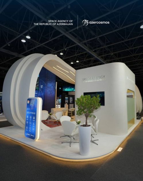 “Azərkosmos” Dubayda keçirilən sərgidə Heydər Əliyev Mərkəzi üslubunda stendlə təmsil olunur