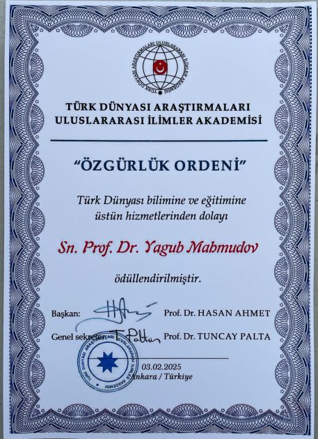 Xatırladaq ki, Yaqub Mahmudov 2019-cu ildə TDABEA-nın həqiqi üzvü seçilib və həmin akademiyanın “Beynəlxalq Qızıl Ulduz” medalı (2019), Beynəlxalq Atatürk Mükafatı (2019), 2019-cu il üçün “Türk dünyasında ilin elm adamı” beynəlxalq mükafatı (2020), “İstiqlal” ordeni (2023) və 2022-ci il üçün “Türk dünyasında ilin adamı” beynəlxalq mükafatı (2023) ilə təltif edilib.