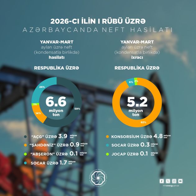 2026-cı ilin yanvar-mart ayları üzrə Azərbaycanda 6,6 milyon ton neft (kondensatla birlikdə) hasil edilib. Hasilatın 3,9 milyon tonu “Azəri-Çıraq-Günəşli”nin, 0,9 milyon tonu “Şahdəniz”in, 0,1 milyon tonu “Abşeron” yatağının payına düşüb. SOCAR üzrə neft (kondensatla birlikdə) hasilatı 1,7 milyon ton təşkil edib.