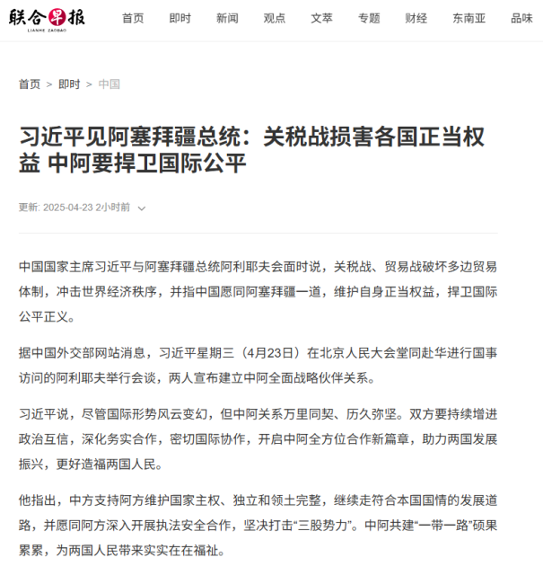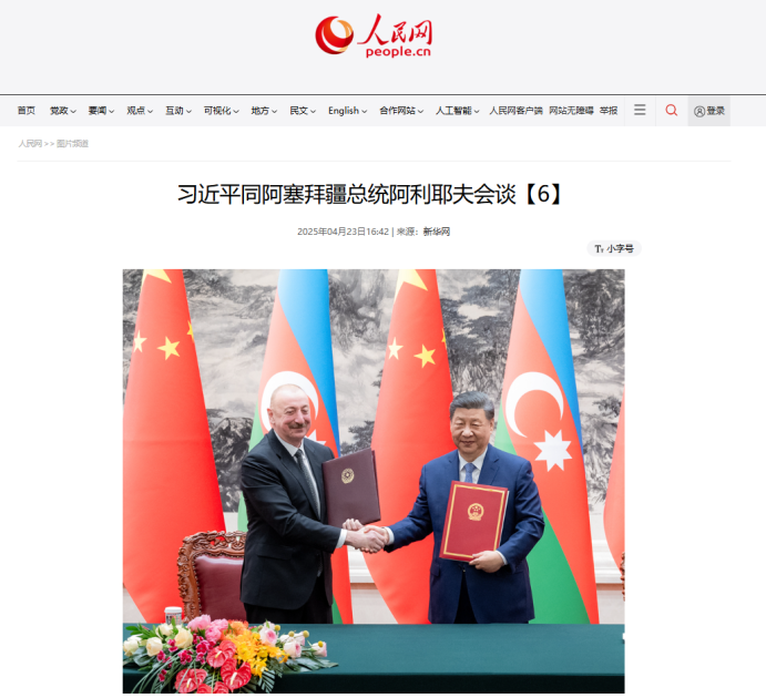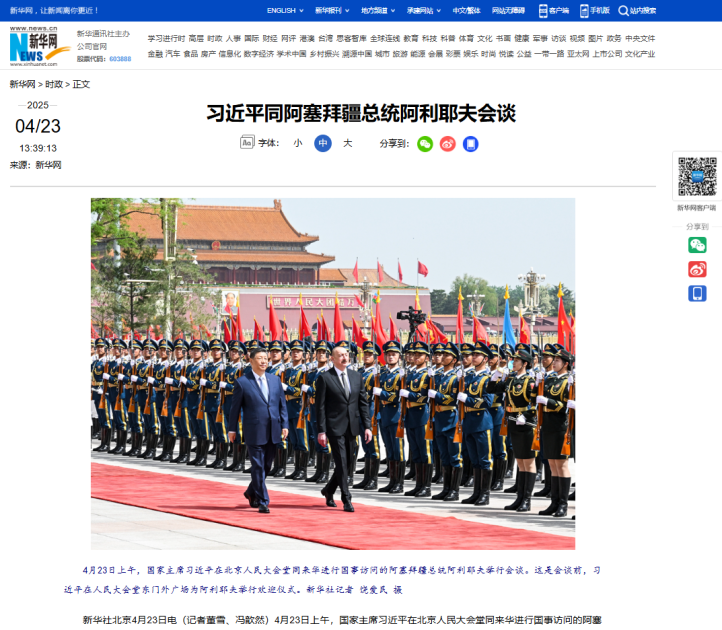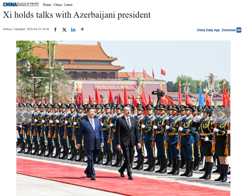 Çinin milli xəbər agentliyi olan Sinxuanın “Si Cinpin Azərbaycan Prezidenti İlham Əliyevlə danışıqlar aparıb” başlıqlı məqaləsində deyilir ki, beynəlxalq vəziyyətin dəyişməsindən asılı olmayaraq Azərbaycan-Çin münasibətləri öz inkişaf dinamikasını qoruyub saxlayıb, iki ölkə qarşılıqlı hörmət, bərabərlik və qarşılıqlı faydalı əməkdaşlıq prinsipləri əsasında inkişaf edərək, strateji tərəfdaşlıq səviyyəsinə yüksəlib.