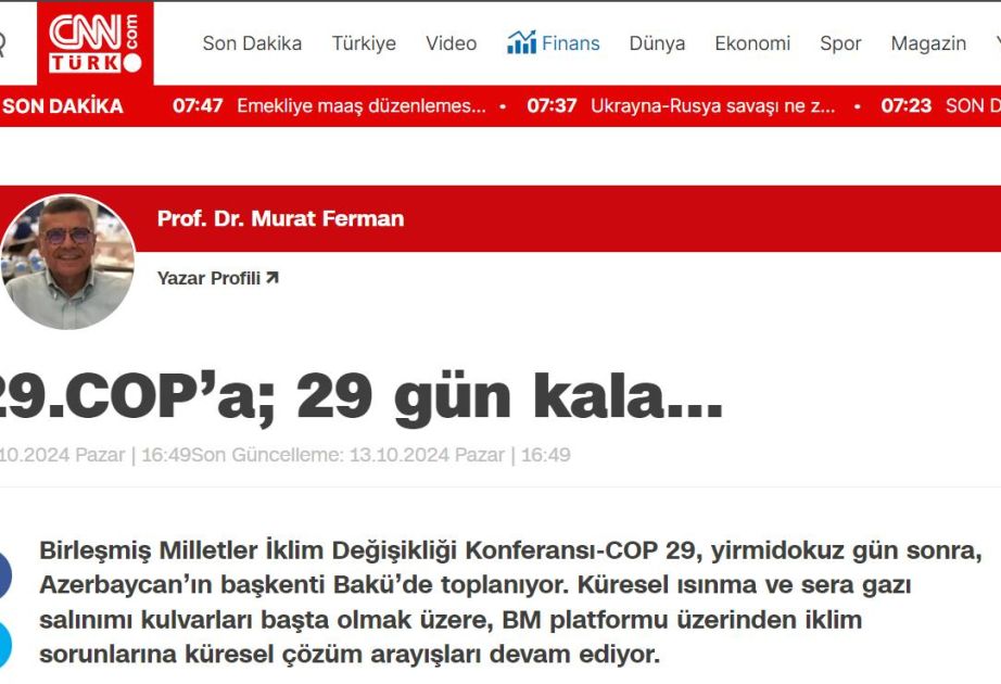 Türkiyənin “CNNTürk” telekanalı BMT-nin İqlim Dəyişikliyi üzrə Çərçivə Konvensiyasının Tərəflər Konfransının 29-cu sessiyasının (COP29) əhəmiyyəti ilə bağlı reportaj hazırlayıb.