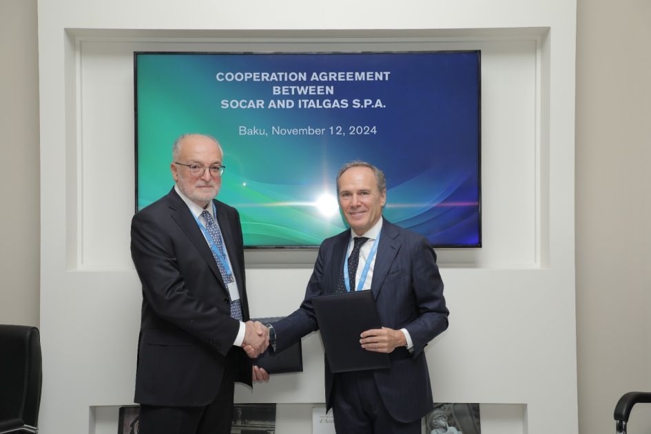 Noyabrın 12-də COP29 çərçivəsində Azərbaycan Respublikası Dövlət Neft Şirkəti (SOCAR) ilə İtaliyanın “İtalgas” şirkəti arasında əməkdaşlığa dair Saziş imzalanıb.