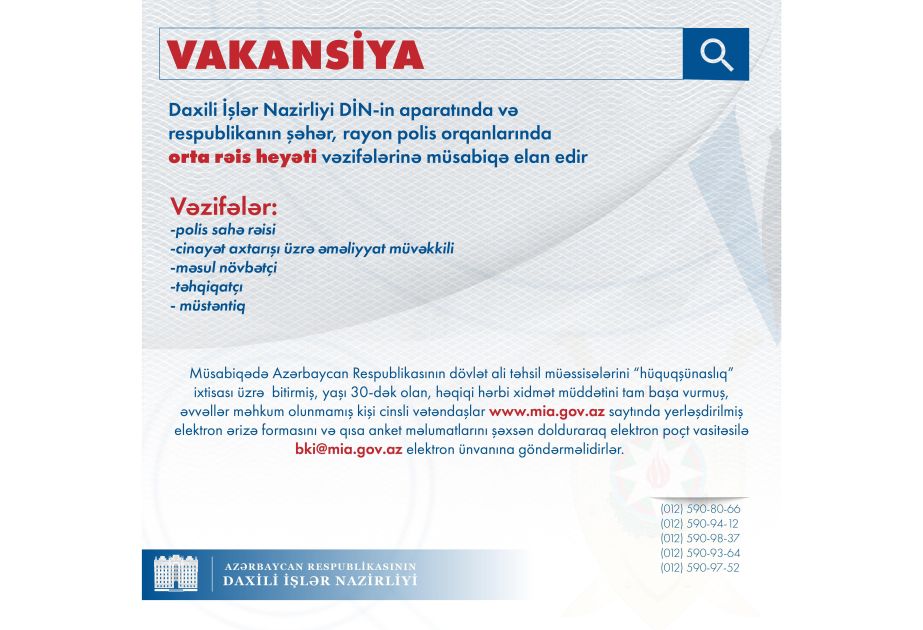 Daxili İşlər Nazirliyinin (DİN) aparatında və respublikanın şəhər, rayon polis orqanlarında ali hüquq təhsili tələb olunan vəzifələrdə (polis sahə rəisi, cinayət axtarışı üzrə əməliyyat müvəkkili, məsul növbətçi, təhqiqatçı və müstəntiq) xidmətə qəbulla əlaqədar müsabiqə keçirilir. Nazirliyin mətbuat xidmətindən AZƏRTAC-a bildirilib ki, vakant olan 70 vəzifənin komplektləşdirilməsi ilə əlaqədar keçirilən müsabiqə test imtahanını və müsahibəni əhatə edir.