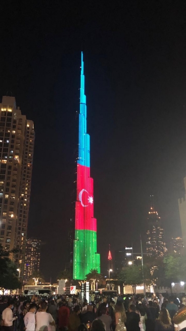 AZƏRTAC xəbər verir ki, Dubay vaxtı ilə saat 23-55-də möhtəşəm binanın üzərində Azərbaycanın dövlət bayrağı və Azərbaycan dilində “Yeni iliniz mübarək” təbriki də əks olunub.