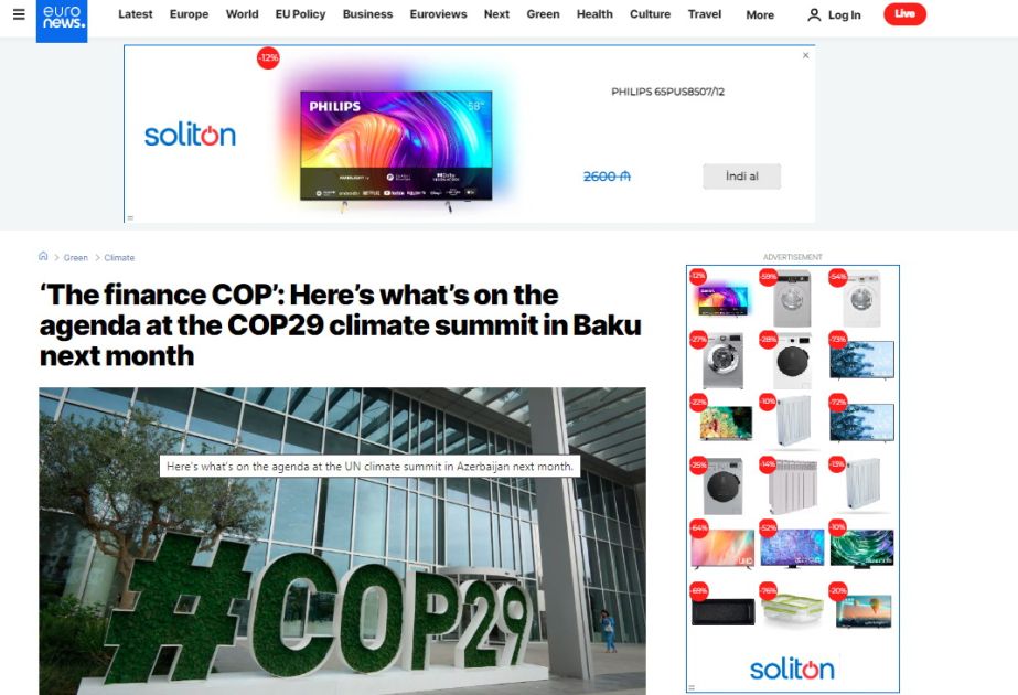 “Euronews” telekanalının saytında Bakıda keçiriləcək COP29 iqlim sammitinin gündəliyi ilə bağlı məqalə dərc edilib.