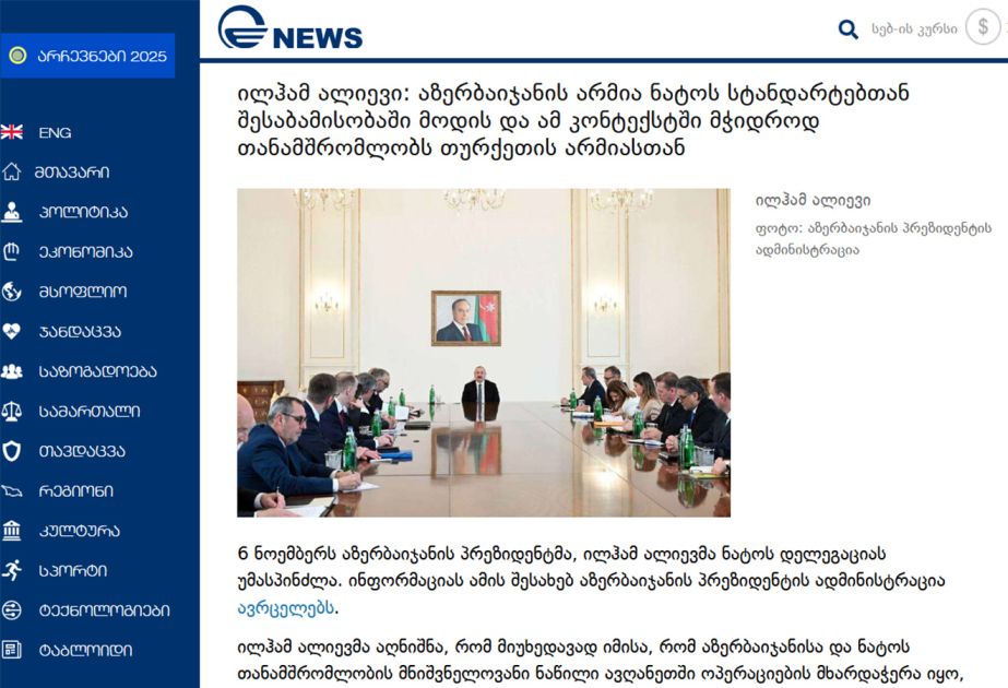 Gürcüstanın 1Tv.ge televiziyası və eyniadlı portalı, imedinews.ge informasiya saytı Prezident İlham Əliyevin noyabrın 6-da NATO nümayəndə heyəti ilə keçirdiyi görüşlə bağlı xəbərlər yayımlayıb.