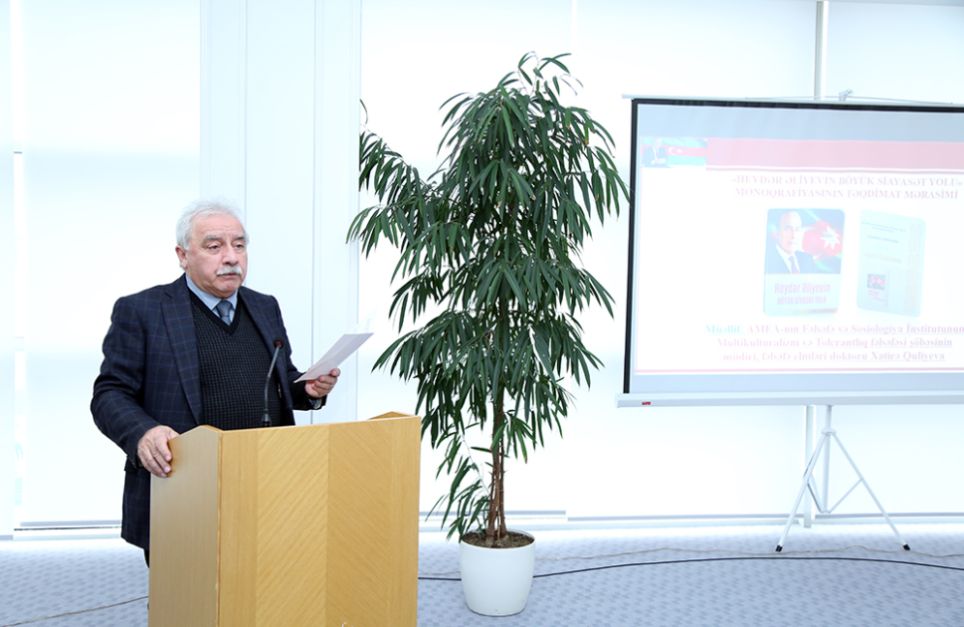 Təqdimat mərasimində, həmçinin AMEA-nın Fəlsəfə və Sosiologiya İnstitutunun direktoru professor İlham Məmmədzadə, elmi işlər üzrə direktor müavini Eynulla Mədətli, həmin institutun şöbə müdirləri professorlar Rəna Mirzəzadə, Azər Mustafayev, baş elmi işçi Ziba Ağayeva, AMEA-nın Tarix və Etnologiya İnstitutunun Heydərşünaslıq şöbəsinin aparıcı elmi işçisi Günel Aslanlı və başqaları çıxış edərək monoqrafiyanın müəllifin çoxillik gərgin əməyinin nəticəsi olduğunu söyləyiblər. Qeyd olunub ki, monoqrafiyada görkəmli dövlət xadiminin zəngin həyatı və fəaliyyəti müəllifin fəlsəfi baxışları ilə tədqiqata cəlb olunub.