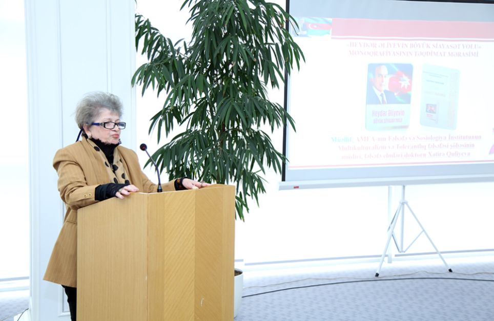 Dekabrın 10-da Mərkəzi Elmi Kitabxanada AMEA-nın Fəlsəfə və Sosiologiya İnstitutunun Multikulturalizm və tolerantlıq fəlsəfəsi şöbəsinin müdiri fəlsəfə elmləri doktoru Xatirə Quliyevanın “Heydər Əliyevin böyük siyasət yolu” monoqrafiyasının təqdimat mərasimi keçirilib.