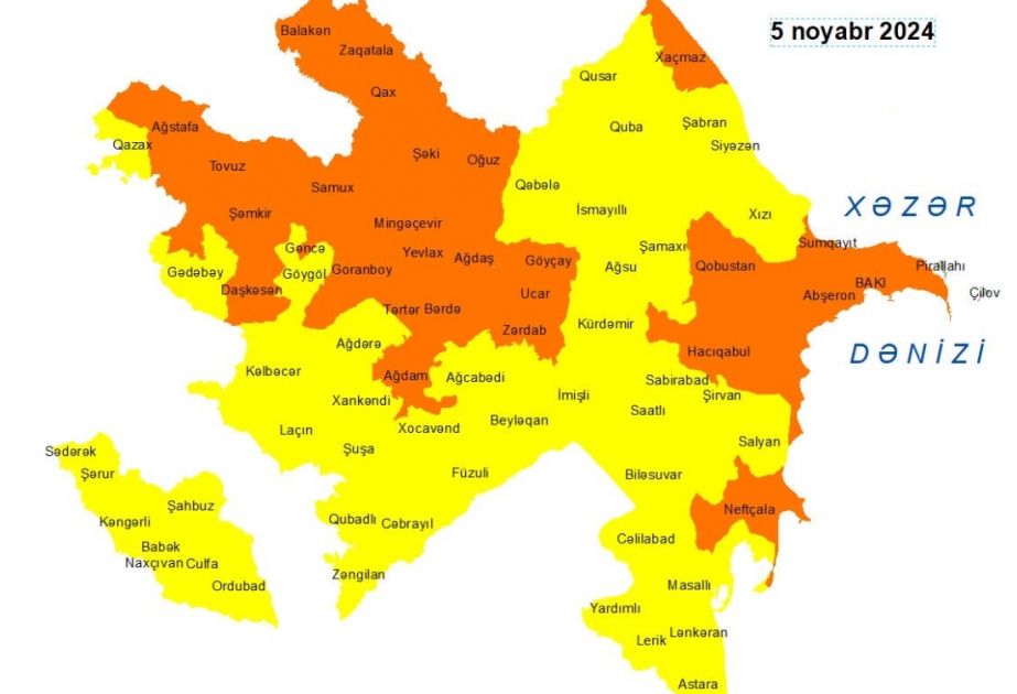 Milli Hidrometeorologiya Xidməti noyabrın 5-də Bakıda və Abşeron yarımadasında, eyni zamanda, bölgələrdə gözlənilən küləkli hava şəraiti ilə bağlı sarı və narıncı xəbərdarlıq verib.
