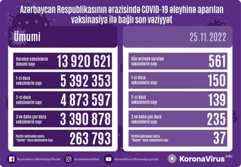 Azərbaycanda bu günə qədər vurulan vaksin dozalarının ümumi sayı 13 milyon 920 min 621, birinci mərhələ üzrə vurulan peyvənd dozalarının ümumi sayı 5 milyon 392 min 353, ikinci mərhələ üzrə 4 milyon 873 min 597, üç və daha çox doza vaksinlərin sayı 3 milyon 390 min 878, pozitiv nəticədən sonra “buster” doza vaksinlərin sayı 263 min 793-dür.