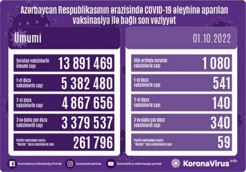 Oktyabrın 1-də Azərbaycanda yeni növ koronavirus (COVID-19) infeksiyası əleyhinə 1080 doza vaksin vurulub.