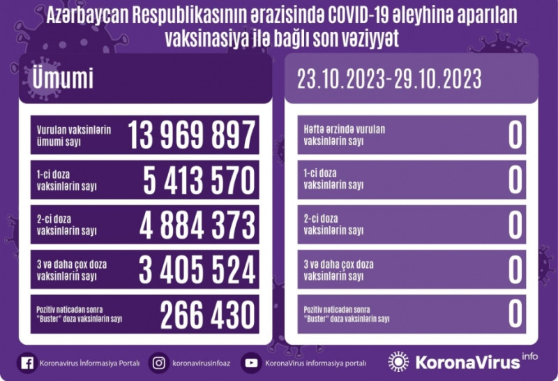 Oktyabrın 23-dən 29-dək Azərbaycanda yeni növ koronavirus (COVID-19) infeksiyası əleyhinə vaksin vurulmayıb.