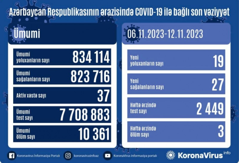 Noyabrın 6-dan 12-nədək Azərbaycanda yeni növ koronavirus (COVID-19) infeksiyasına 19 yoluxma faktı qeydə alınıb, 27 nəfər müalicə olunaraq sağalıb.