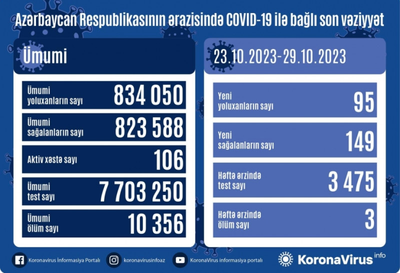 Oktyabrın 23-dən 29-dək Azərbaycanda yeni növ koronavirus (COVID-19) infeksiyasına 95 yoluxma faktı qeydə alınıb, 149 nəfər müalicə olunaraq sağalıb.