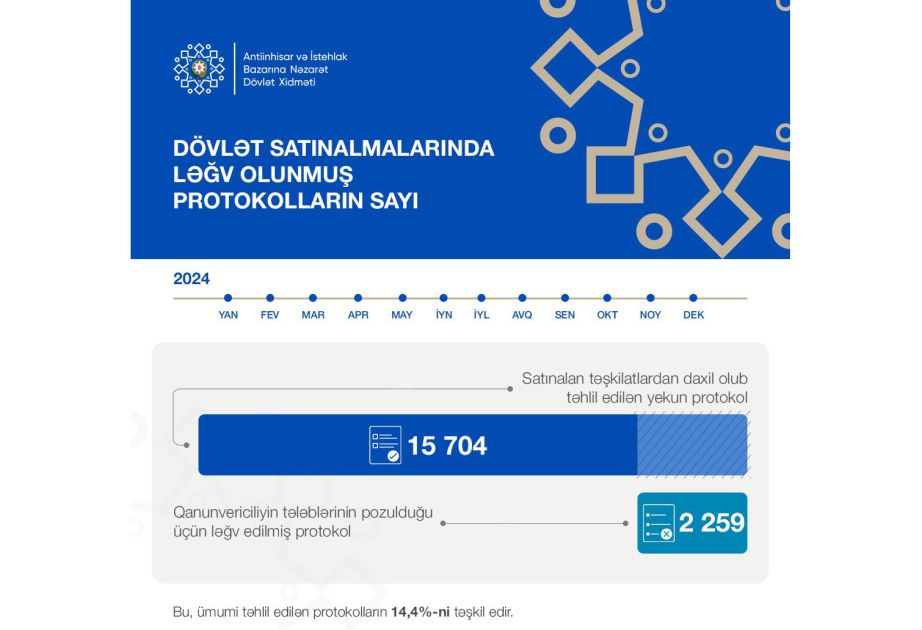 Ötən il ərzində satınalan təşkilatlardan Antiinhisar və İstehlak Bazarına Nəzarət Dövlət Xidmətinə daxil olmuş 15 min 704 yekun protokol təhlil edilib.