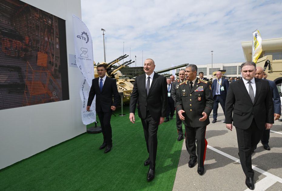 Prezident İlham Əliyev əvvəlcə Azərbaycan Müdafiə Sənayesi Nazirliyinin tabeliyindəki “Azərsilah” Müdafiə Sənayesi Holdinqi” Qapalı Səhmdar Cəmiyyətinin pavilyonunda nümayiş etdirilən hərbi məmulatlara baxdı. “Azərsilah”a məxsus pavilyonda PUA, müxtəlif növ kəşfiyyat və kamikadze dronları, 30 millimetrlik avtomatik top, zirehli gödəkcələr, aviabombalar və təlim simulyatorları nümayiş etdirilir.