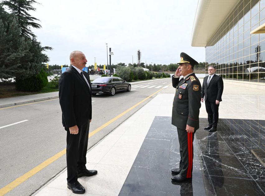 Sonra Prezident İlham Əliyev Bakı Ekspo Mərkəzinin qarşısında nümayiş etdirilən hərbi məhsullara və texnikalara baxdı.