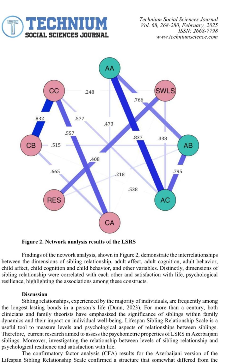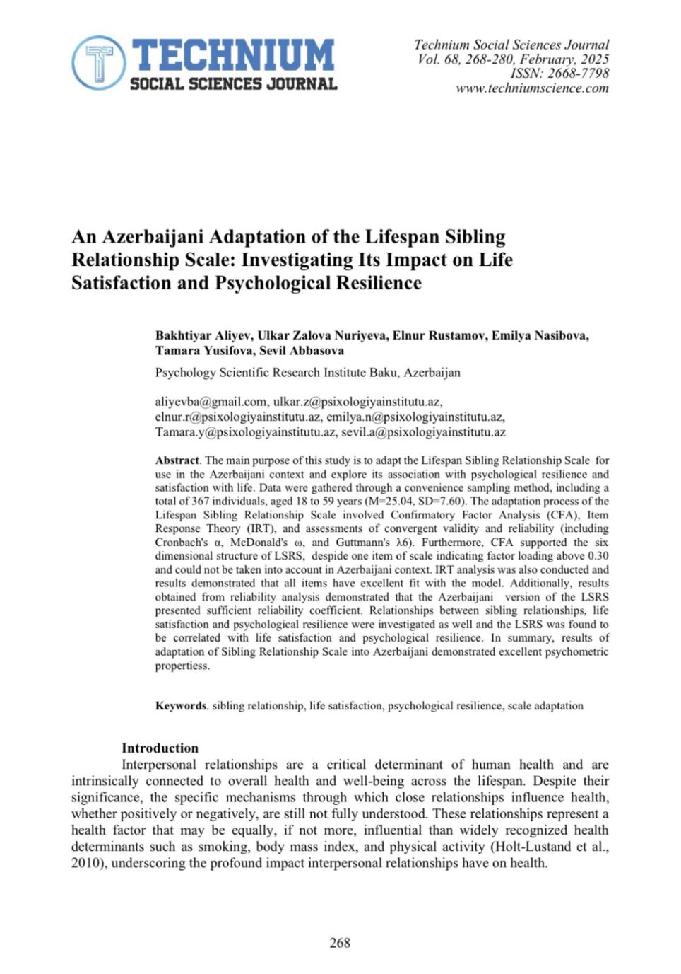 Psixologiya Elmi-Tədqiqat İnstitutunun elmi rəhbəri AMEA-nın müxbir üzvü, professor Bəxtiyar Əliyev, institutun sədri,fəlsəfə üzrə fəlsəfə doktoru Elnur Rüstəmov, institutun əməkdaşları Ülkər Zalova Nuriyeva, Emilya Nəsibova, Tamara Yusifova və Sevil Abbasovanın Azərbaycan dilinə adaptasiyasını həyata keçirdkləri “Ömür boyu bacı-qardaş münasibətləri şkalası”nın (Lifespan sibling relationship scale) tədqiqat məqaləsi “Index Copernicus”, “EBSCO”, “Crossref” kimi beynəlxalq xülasələndirmə və indeksləmə bazalarına daxil olan “Technium Sosial Elmlər Jurnalı”nda dərc edilib.