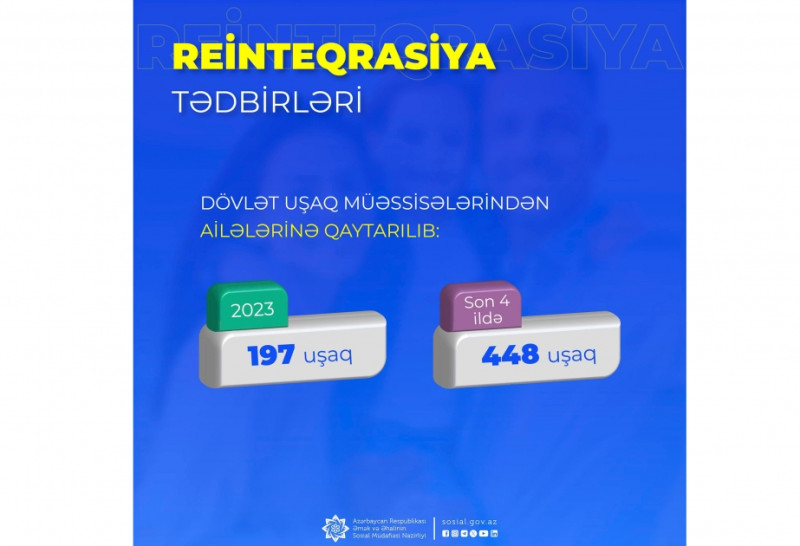 Nazirliyin İctimaiyyətlə əlaqələr şöbəsindən AZƏRTAC-a verilən məlumata görə, reinteqrasiyayönümlü həmin tədbirlər nəticəsində ötən il daha 197 uşaq dövlət uşaq müəssisələrindən ailələrinin himayəsinə qaytarılıb.