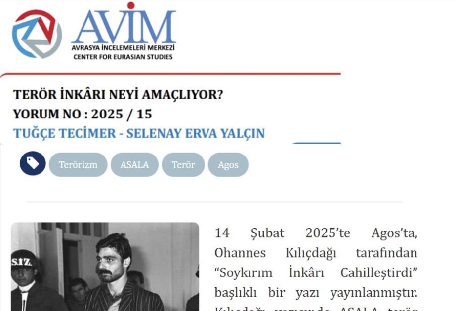 AZƏRTAC xəbər verir ki, Ankara Avrasiya Araşdırmaları Mərkəzinin (AVİM) analitikləri Tuğçe Tecimer və Selenay Erva Yalçın 1982-ci ildə Ankara hava limanına hücumda iştirak edən ASALA silahlıları Zohrab Sarkisyan və Levon Ekmekciyanın terrorçu adlandırıla bilməyəcəyini iddia edən nəşrin müəllifinin mövqeyi ilə bağlı qəzəblərini ifadə ediblər.