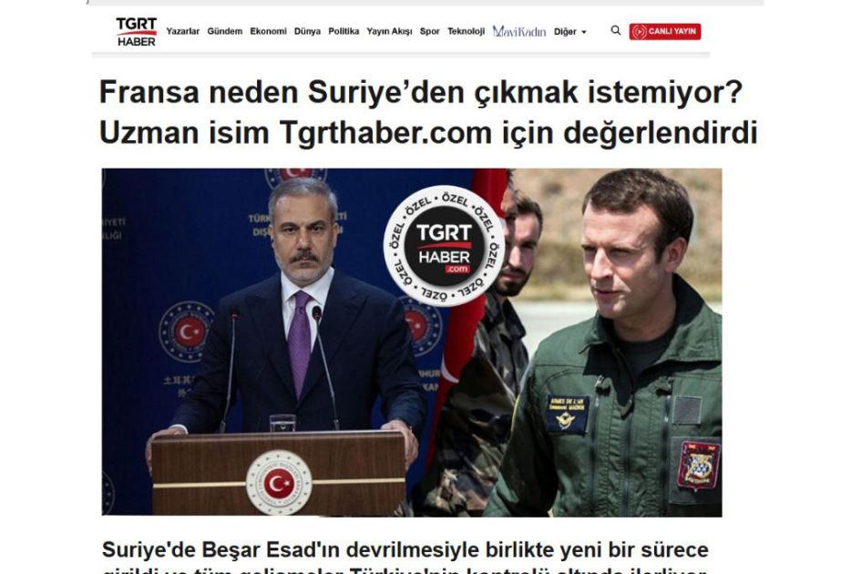 AZƏRTAC xəbər verir ki, bu barədə Türkiyənin “TGRT Haber” xəbər kanalının Suriyada hakimiyyət dəyişikliyinə və Türkiyə ilə Fransa arasındakı münasibətlərdəki gərginliyə həsr olunmuş reportajında deyilir.