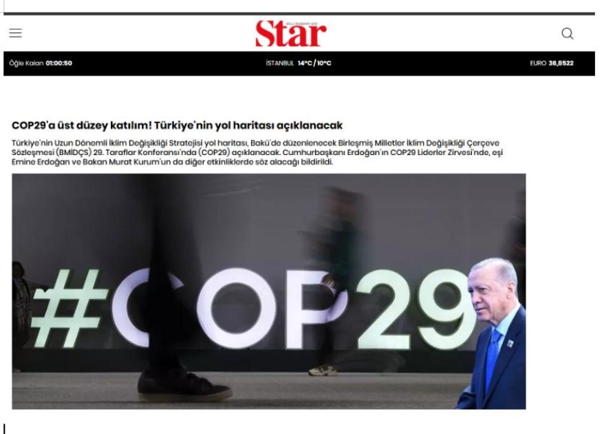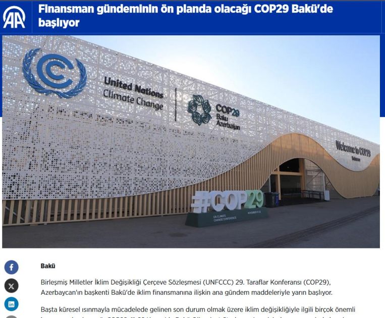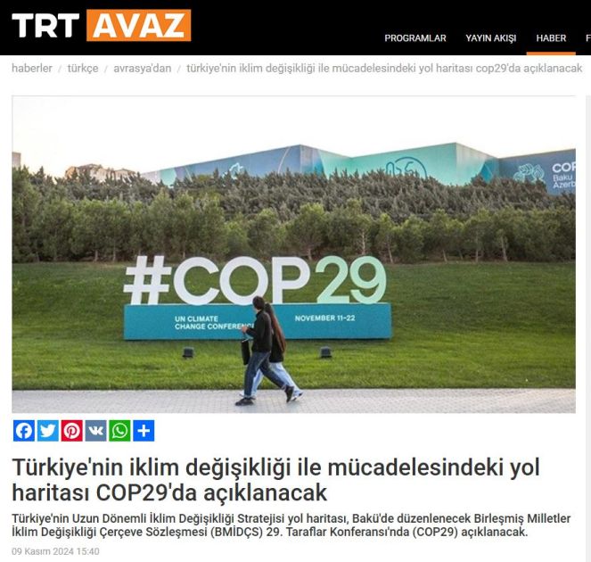 Türkiyə və Şimali Kipr Türk Cümhuriyyətinin (ŞKTC) aparıcı media orqanları BMT-nin İqlim Dəyişmələri üzrə Çərçivə Konvensiyasının Tərəflər Konfransının Azərbaycanda keçiriləcək 29-cu sessiyasının (COP29) mövzusunu geniş şəkildə işıqlandırıb.