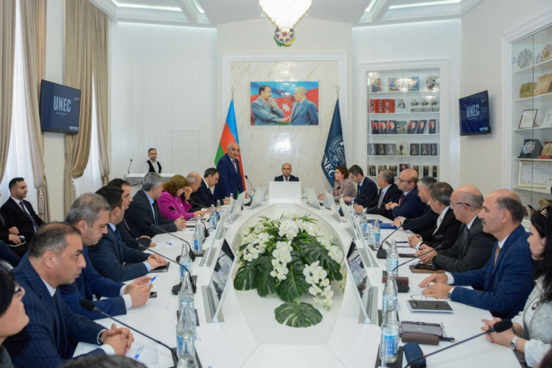 Sonra müasir tələblərə cavab verən yeni Müzakirə zalında nazir Emin Əmrullayev, rektor Ədalət Muradov, prorektorlar, dekanlar və müvafiq struktur rəhbərlərinin iştirakı ilə ali təhsilin aktual məsələləri ilə bağlı geniş müzakirələr aparılıb. Rektor Ədalət Muradov Qarabağda UNEC-in filialının açılmasını təklif edib.