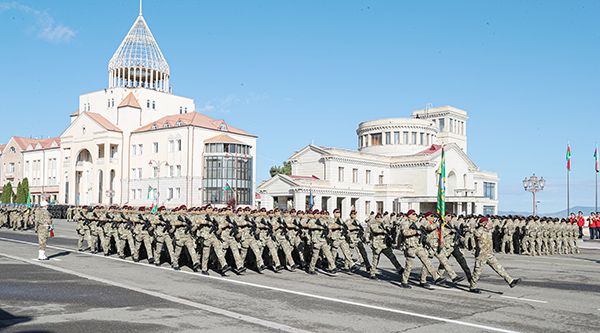 Müzəffər Ali Baş Komandanın çıxışından sonra Silahlı Qüvvələrin parad heyətlərinin hərbi orkestrin müşayiəti ilə təntənəli keçidi oldu. Silahlı Qüvvələrin parad heyətləri Azərbaycanın Dövlət Bayrağı və Şuşa şəhərinə sancılan - Qələbənin rəmzinə çevrilən Zəfər Bayrağı altında tribunaya doğru irəlilədilər. Ardınca Azərbaycan Ordusunun və qoşun növlərinin, lokal xarakterli antiterror tədbirlərində iştirak etmiş hərbi birləşmələrin döyüş bayraqları Xankəndi şəhərinin mərkəzi meydanına gətirildi. Sonra Müdafiə Nazirliyinin Xüsusi Təyinatlı Qüvvələrinin parad heyətinin keçidi oldu. Əlahiddə Ümumqoşun Ordunun parad heyətləri tribuna önündən mətin addımlarla irəlilədilər...