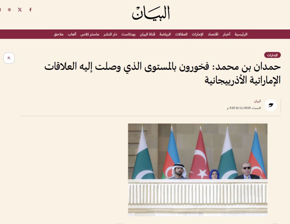 Birləşmiş Ərəb Əmirliklərinin aparıcı media qurumları da, o cümlədən “ARN News Centre”, “UAE BARQ”, “Emarat Al Youm”, “Al Bayan”, “Sharjah24” və “20Four” portalları Vətən müharibəsində Qələbənin beşinci ildönümünə həsr olunmuş Hərbi paradı geniş işıqlandırıb. Xəbərlərdə Bakıda keçirilən Hərbi paradın möhtəşəmliyi, nümayiş etdirilən hərbi texnika və Azərbaycan Ordusunun hərbi qüdrəti barədə ətraflı məlumat verilib. Xüsusi diqqət Azərbaycan Prezidenti İlham Əliyevin, Türkiyə Prezidenti Rəcəb Tayyib Ərdoğanın və Pakistanın Baş naziri Məhəmməd Şahbaz Şərifin paraddakı çıxışlarında səsləndirdiyi fikirlərə yönəldilib. Materiallarda Azərbaycan və Türkiyə liderlərinin regional əməkdaşlıq, Cənubi Qafqazda sülh və sabitliyin təmin olunması barədə bəyanatları da yer alıb.