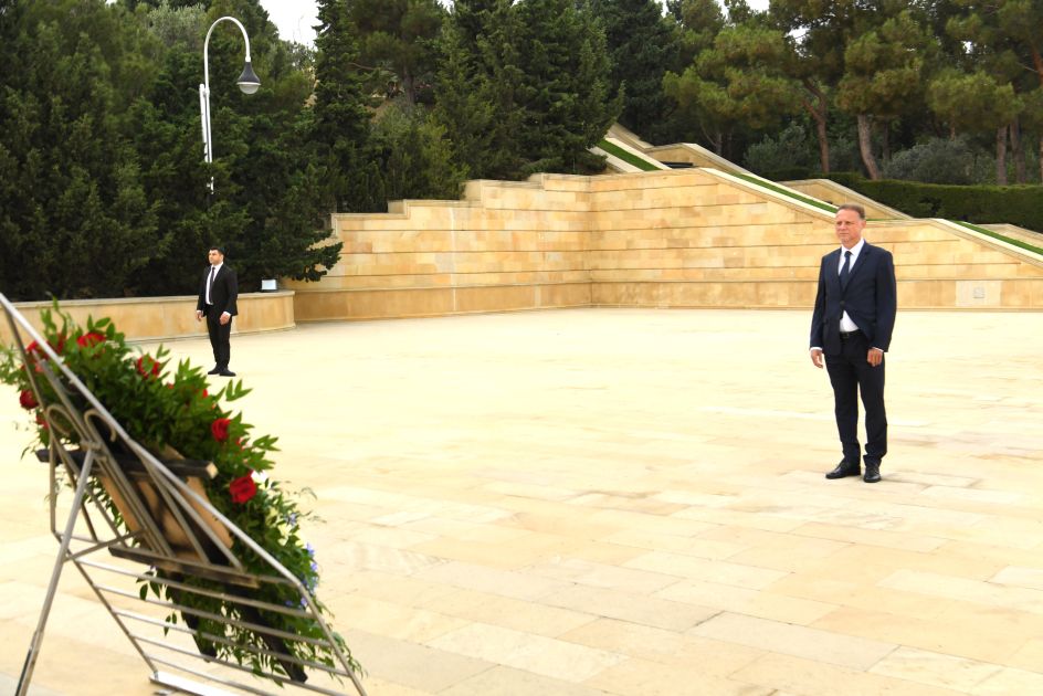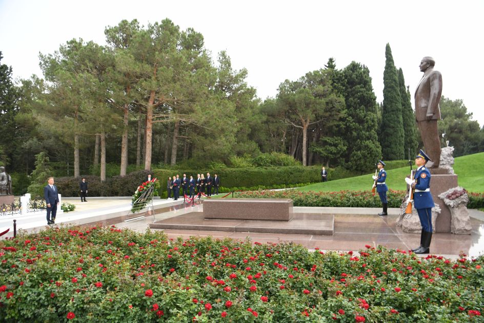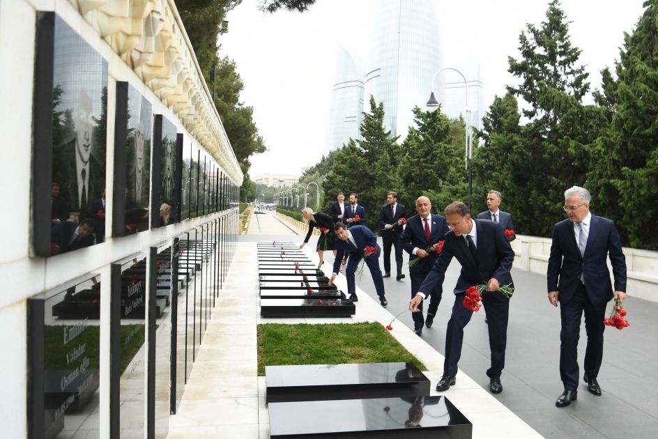 AZƏRTAC xəbər verir ki, sonra qonaqlar Şəhidlər xiyabanında Azərbaycanın müstəqilliyi və ərazi bütövlüyü uğrunda mübarizədə canlarından keçmiş qəhrəman Vətən övladlarının xatirəsini ehtiramla yad edib, “Əbədi məşəl” abidəsinin önünə əklil qoyublar.