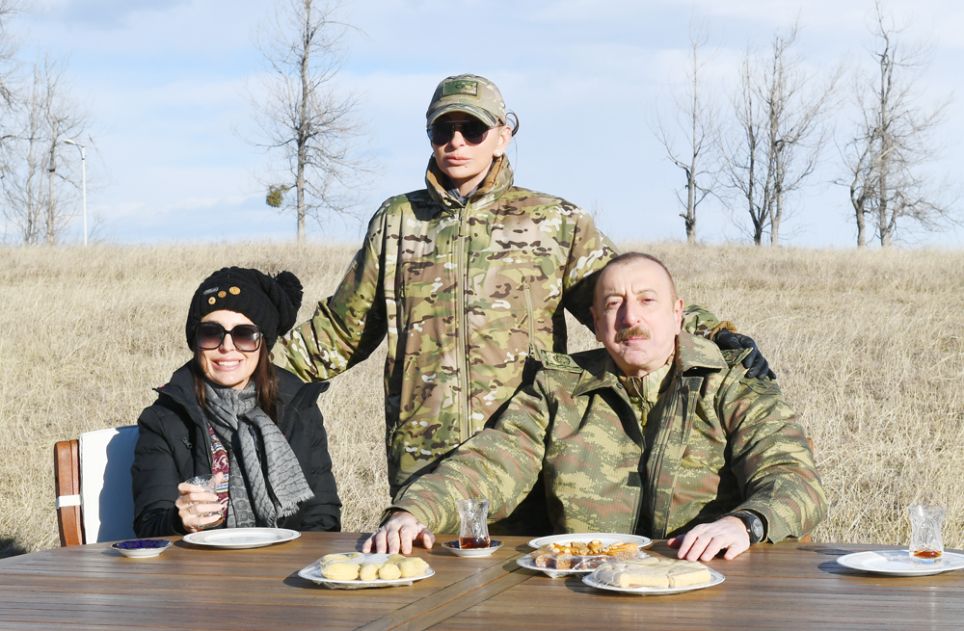 Müzəffər Ali Baş Komandan İlham Əliyev tonqalın yanında oturaraq armudu stəkanda pürrəngi çay içib Novruzun rəmzlərindən sayılan şəkərbura, paxlava yedi!