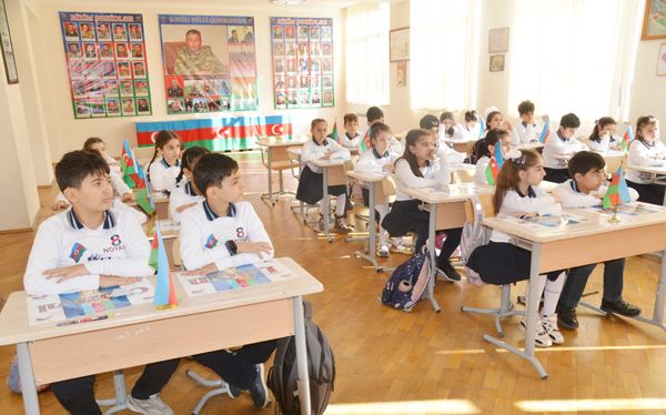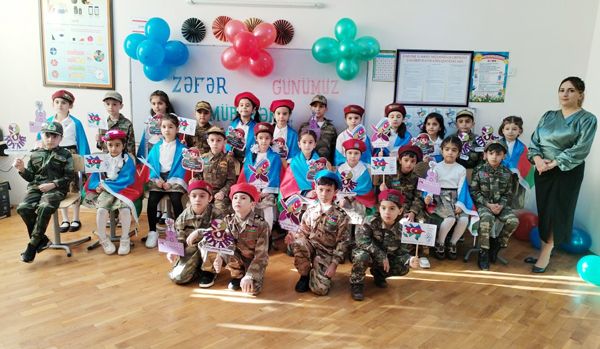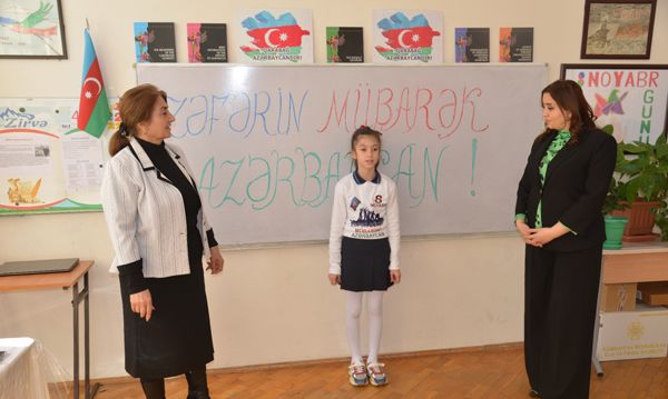 Əvvəlcə ibtidai sinif müəllimləri Sədiqə Kərimova, Bəniyə Qarayeva şagirdlərə Zəfər Günündən danışdılar. Bildirdilər ki, 27 sentyabr 2020-ci ildə erməni təxribatı nəticəsində İkinci Qarabağ müharibəsi başladı. Zabit və əsgərlərimiz torpaqlarımızı müdafiə etmək, düşmən hücumunun qarşısını almaq üçün yüksək əhvali-ruhiyyə ilə döyüşlərə atıldılar. Hərbçilərimizin qəhrəmanlığı, cəsarəti sayəsində erməni işğalçılarının hücumları dayandırıldı. Uzun illərdən bəri qəsbkarların işğalında qalmış torpaqlarımız azad olunmağa başlanıldı. Şanlı Azərbaycan Ordusunun zabit və əsgərləri Müzəffər Ali Baş Komandan İlham Əliyevin rəhbərliyi altında döyüşlərdə böyük hünər və qəhrəmanlıq göstərərək düşmənləri torpaqlarımızdan qovdular. 30 ilə yaxın işğalda qalmış ərazilərimiz azadlığına qovuşdu. İkinci Qarabağ müharibəsinin 42-ci günü musiqi beşiyimiz olan Şuşa şəhəri erməni işğalçılarından təmizləndi. Noyabrın 10-da düşmən məğlub olduğuna görə döyüşlər dayandırıldı. Azərbaycan Prezidenti İlham Əliyevin 3 dekabr 2020-ci il tarixli sərəncamı ilə hər birimiz üçün əziz və müqəddəs olan Şuşanın işğaldan azad olunduğu gün - 8 Noyabr Zəfər Günü kimi təsis edildi. Bu əlamətdar gün münasibətilə müəllimlər şagirdləri təbrik etdilər və onlara dərslərində uğurlar arzuladılar.